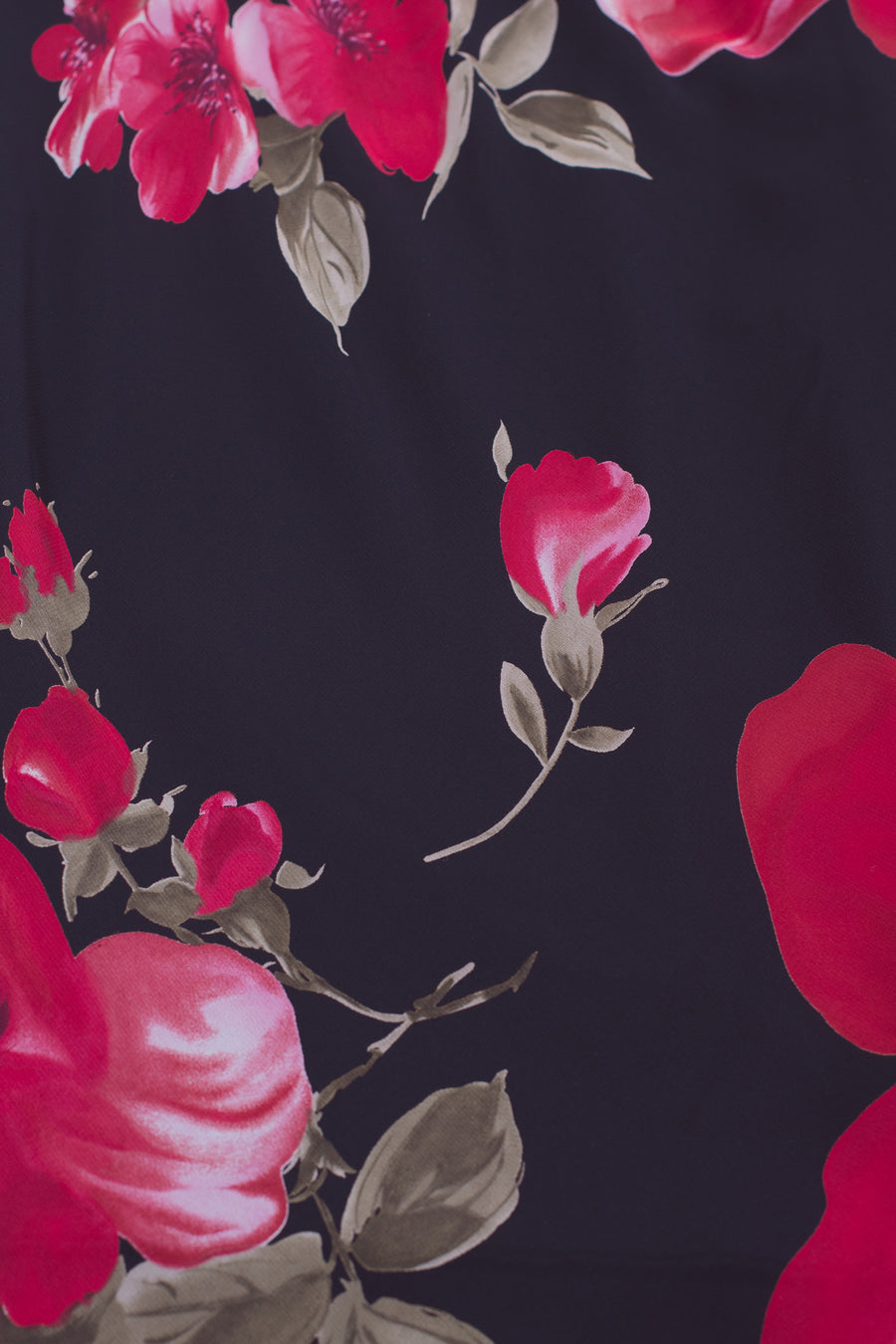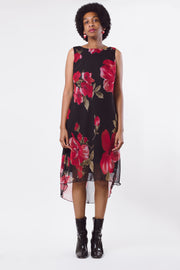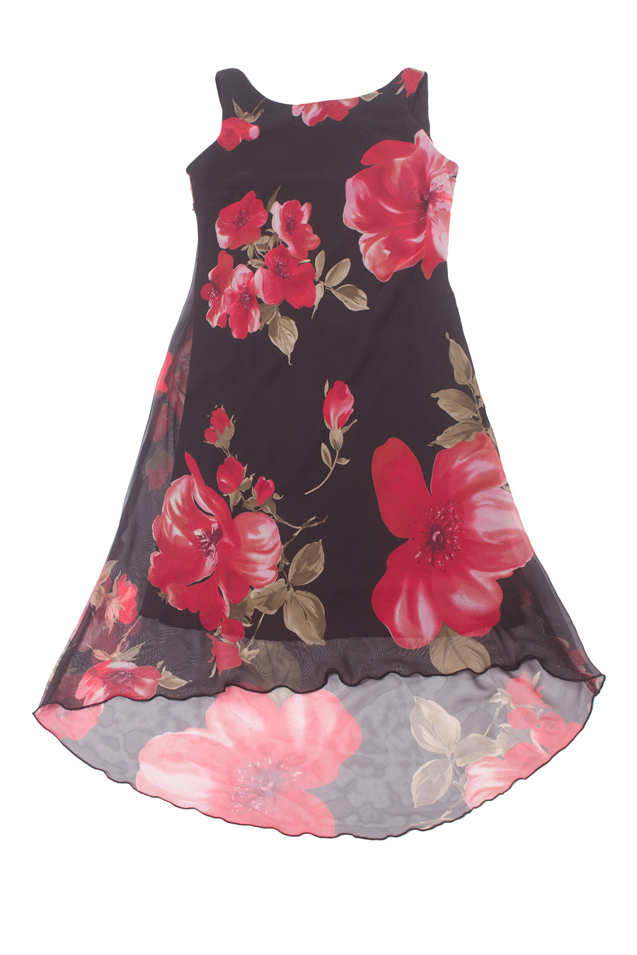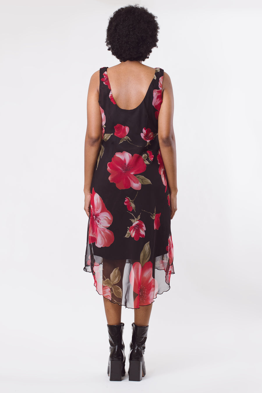 This vintage 90's floral midi dress is sleeveless with an outer black floral shell that is short in the front and long in the back. With a scooped neckline in the back, this floral dress is perfect for the spring/ summer season!