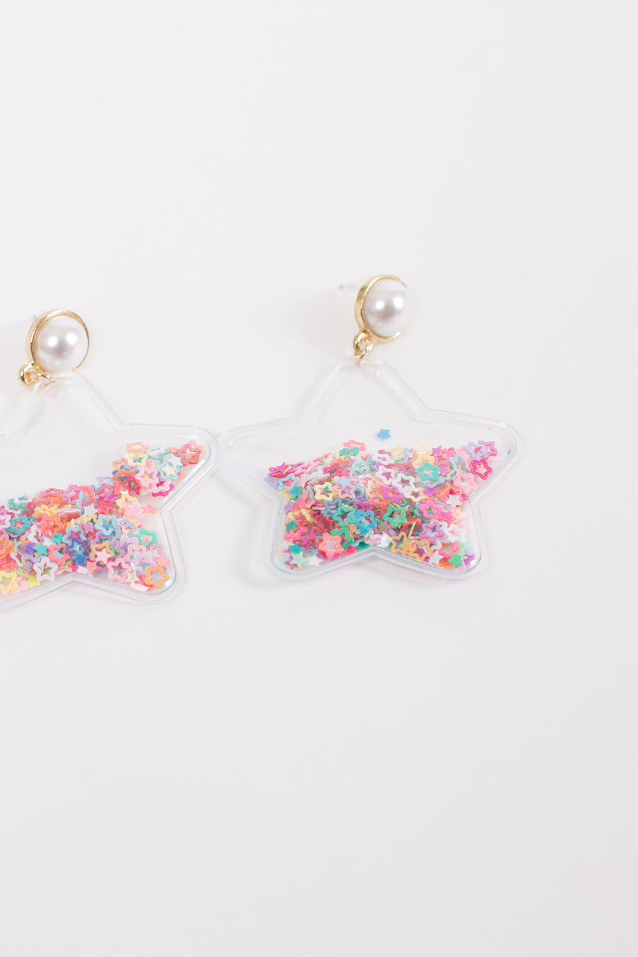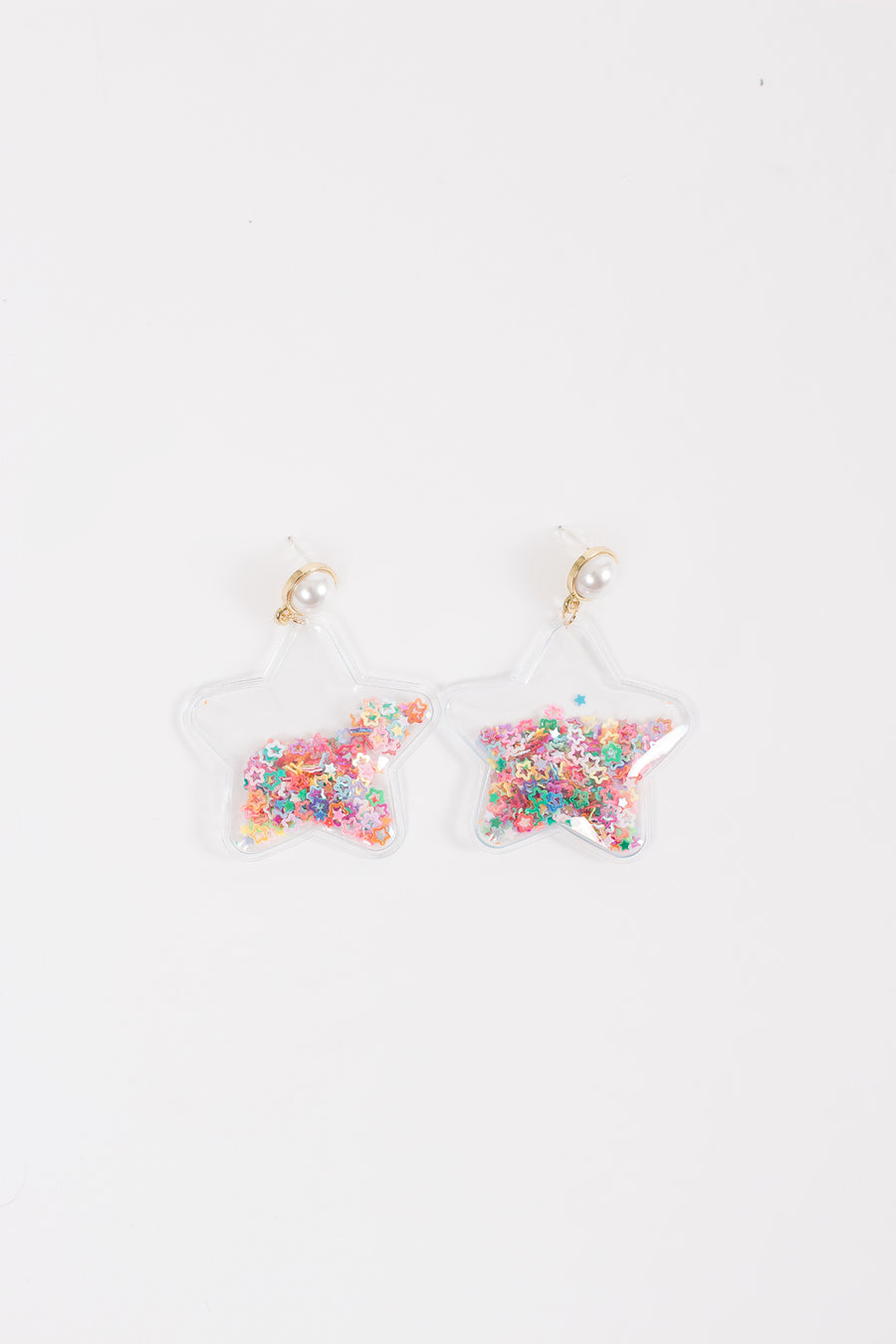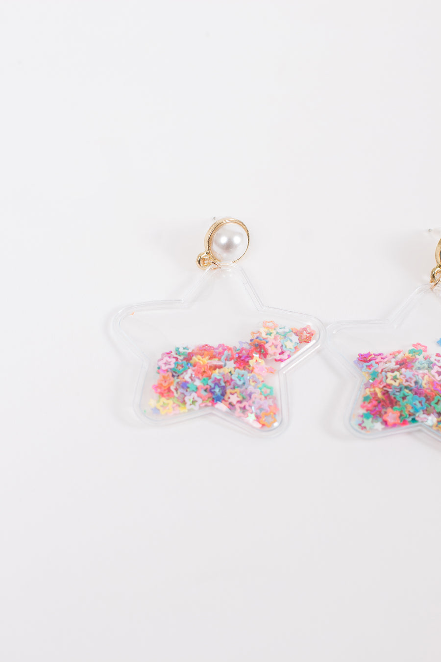 These star drop earrings are a perfect edition for you wardrobe! They are translucent and have tiny, glitter stars inside.