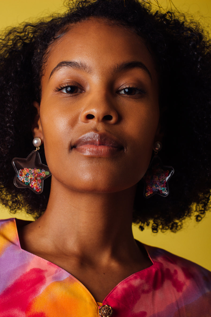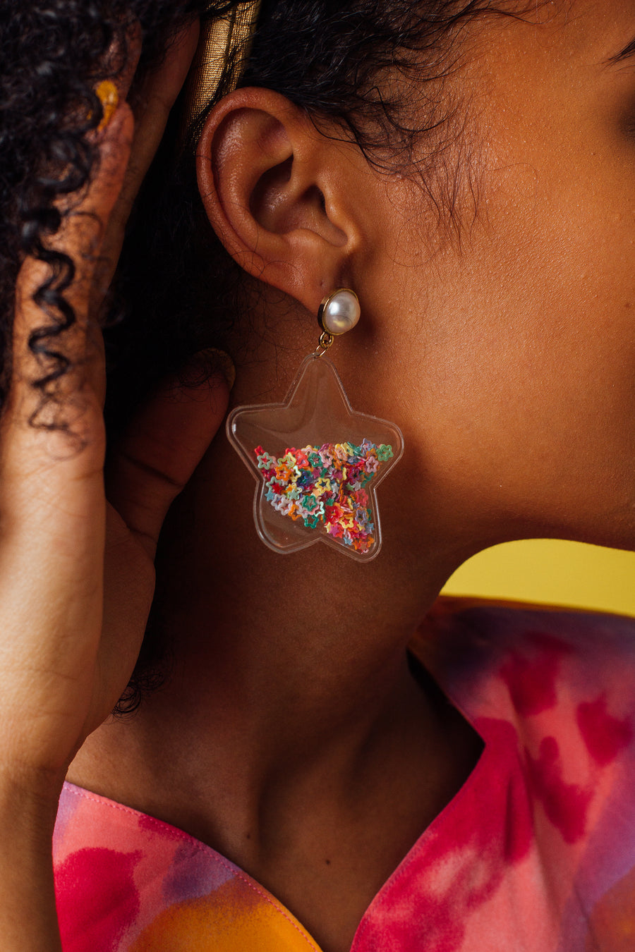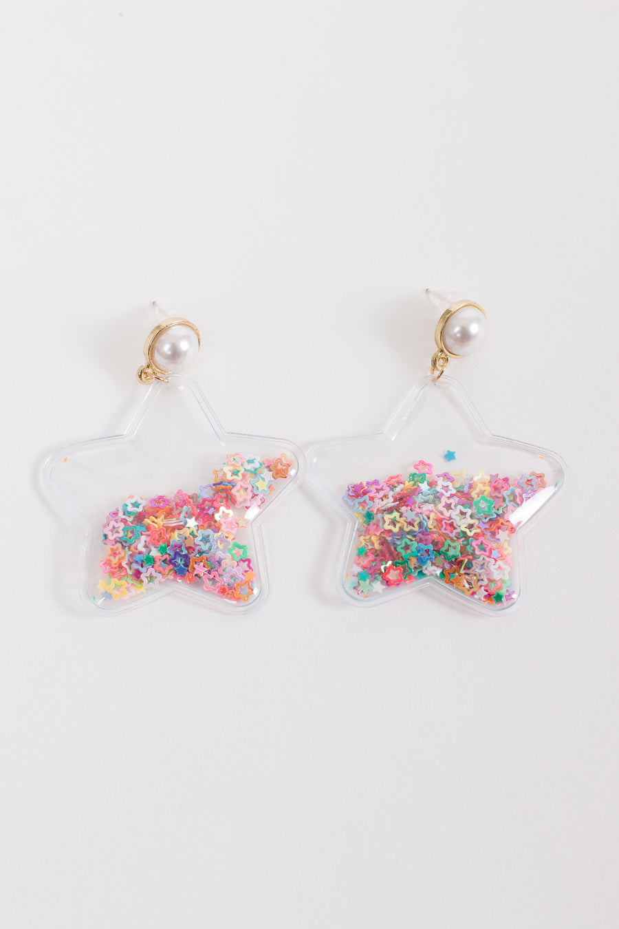 These star drop earrings are a perfect edition for you wardrobe! They are translucent and have tiny, glitter stars inside.