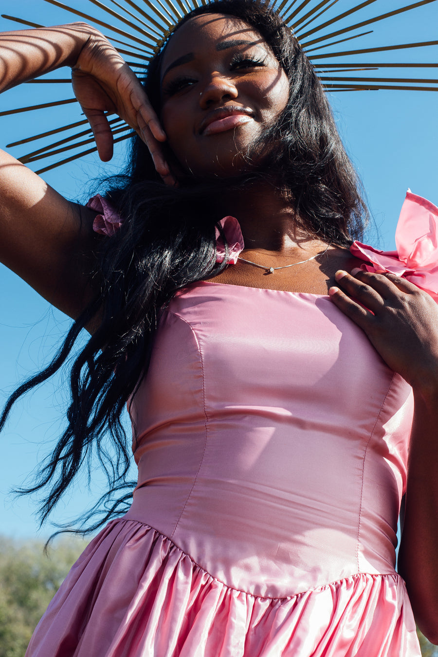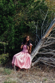 This vintage 80's pink maxi prom dress has cute ruffle sleeves, with elastic inside that has some give for the shoulder area. With a zipper in the back, wear this beautiful gown for any special occasion to impress, or just look like the bell of the ball!