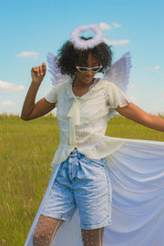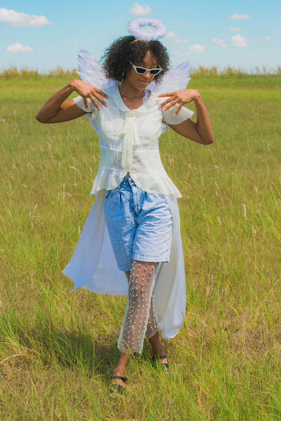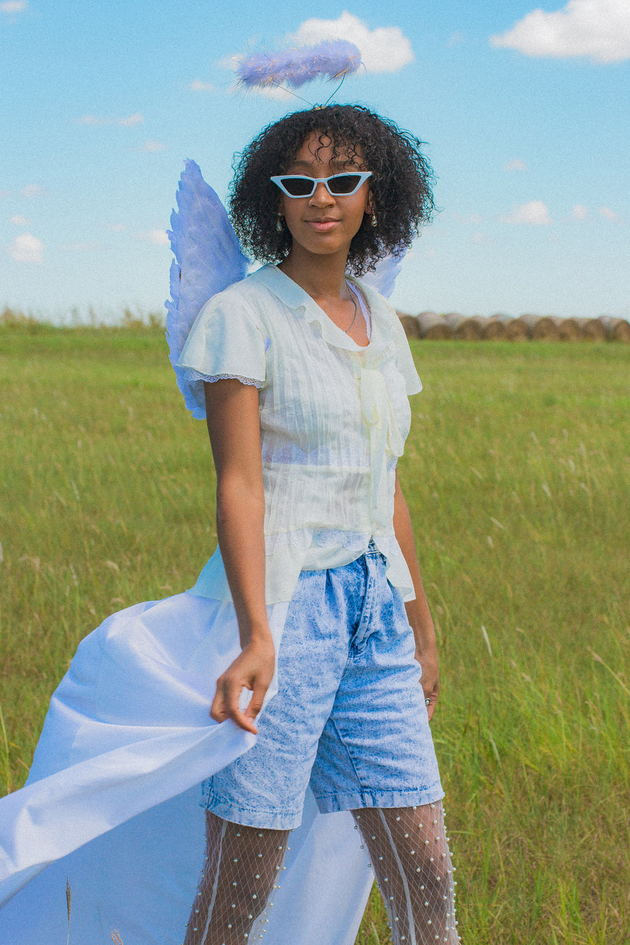 This pair of vintage acid wash denim shorts would look wonderful layered with our pearl leggings.