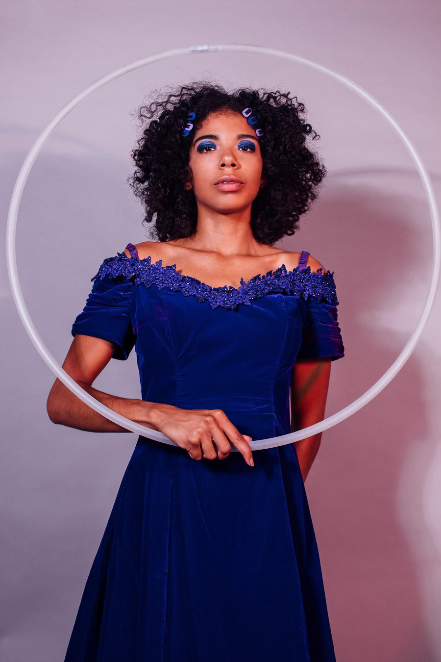 This vintage y2k purple velvet dress sits off-the-shoulder and has gorgeous floral detailing along the collar.