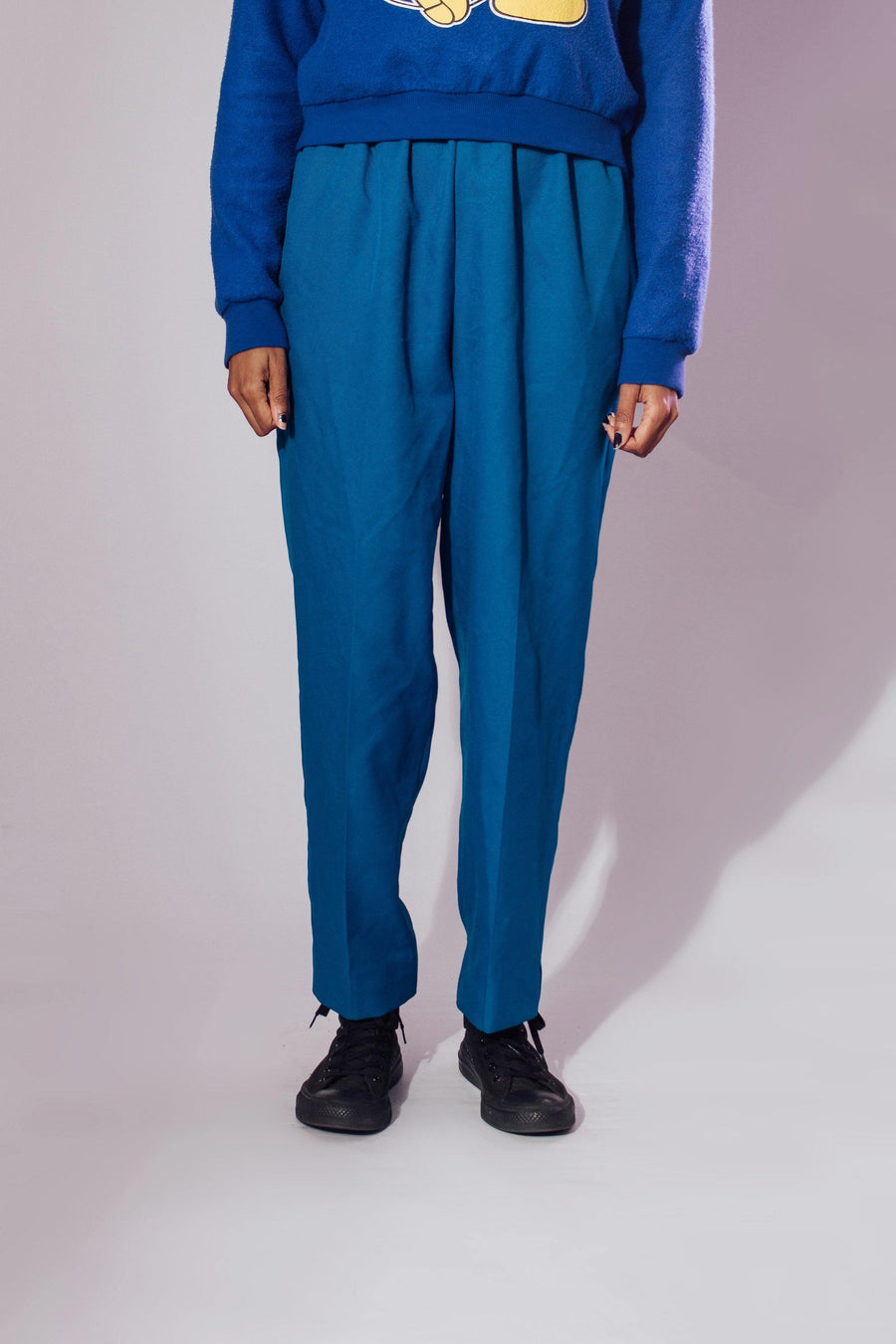 These vintage highwaist pants are a gorgeous blue color with two pockets and an elastic waist. Perfect for the fall and winter months.