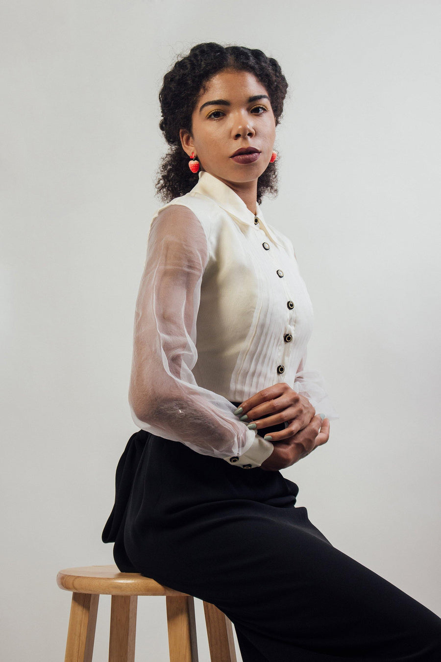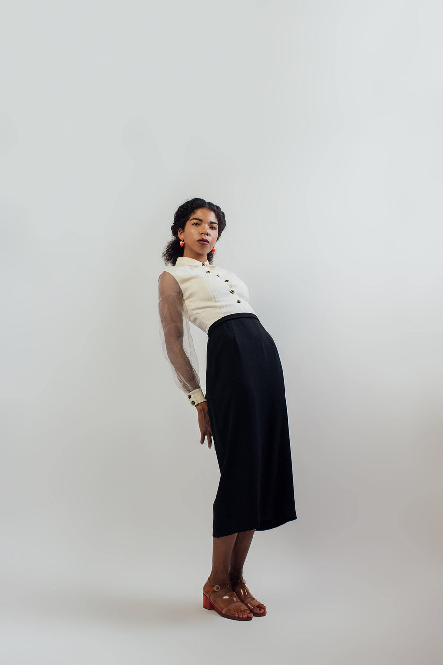 This vintage 90's black tuxedo dress is elegant and refined. It has transparent long sleeves, decorative black buttons on the front, and has a detachable belt that ties in the back. Perfect for a night out on the town or a gift for that special someone.
