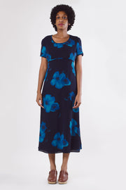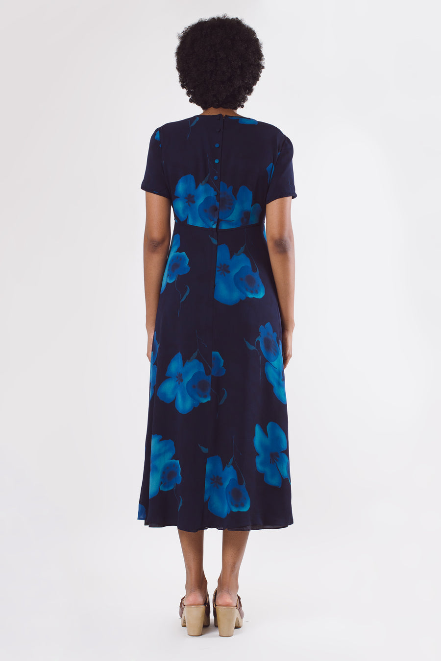 This vintage blue Liz Claiborne floral maxi dress is lightweight and perfect for the summer. The dress zips-up in the back with decorative buttons, and is a perfect addition to anyone's wardrobe.