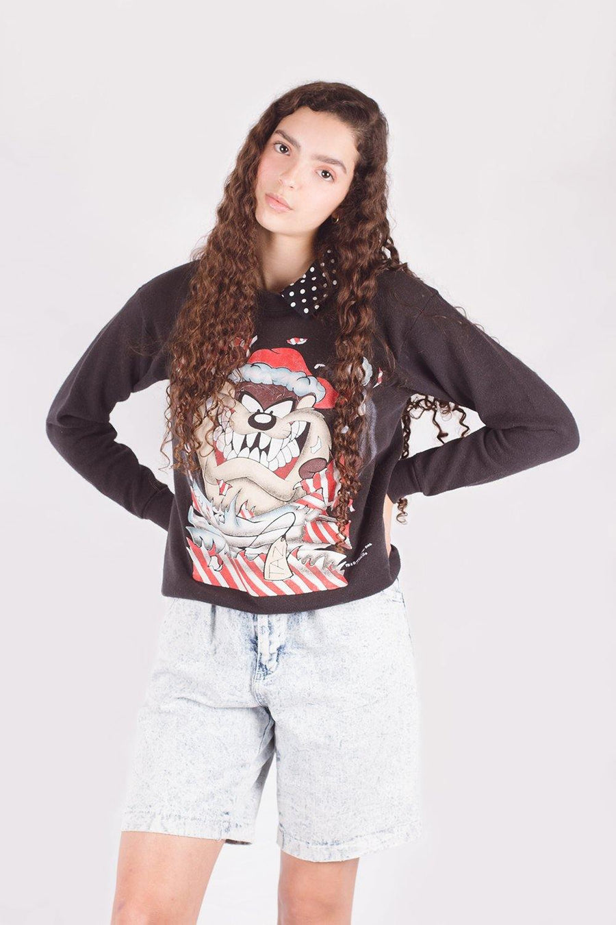 This vintage Looney Tunes Tasmanian Devil sweatshirt features a cute graphic of the character wearing a Santa hat. It can be layered for the winters months.